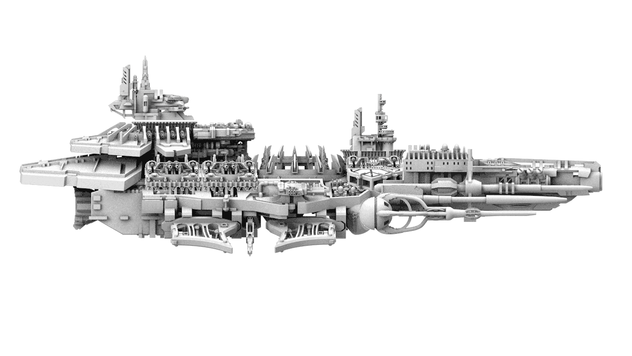 The Star Destroyer was commissioned by the Engineering Corps in M31.040 as a prototype mobile mining carrier designed to harvest dead planets. The main cannon was capable of cracking open planetary mantles, exposing valuable minerals underneath. The ship, crew and accompanying escorts disappeared in a freak warp storm during its shakedown cruise. The ship appeared in its corrupted form 500 years later, overhauled and equipped with all kinds of infernal weaponry. However the vessel was never designed to be a warship and is woefully underpowered in the maneuvering department, making it vulnerable to flanking attacks. It now serves as the flagship of Vice Admiral Stukov, an infested Terran.