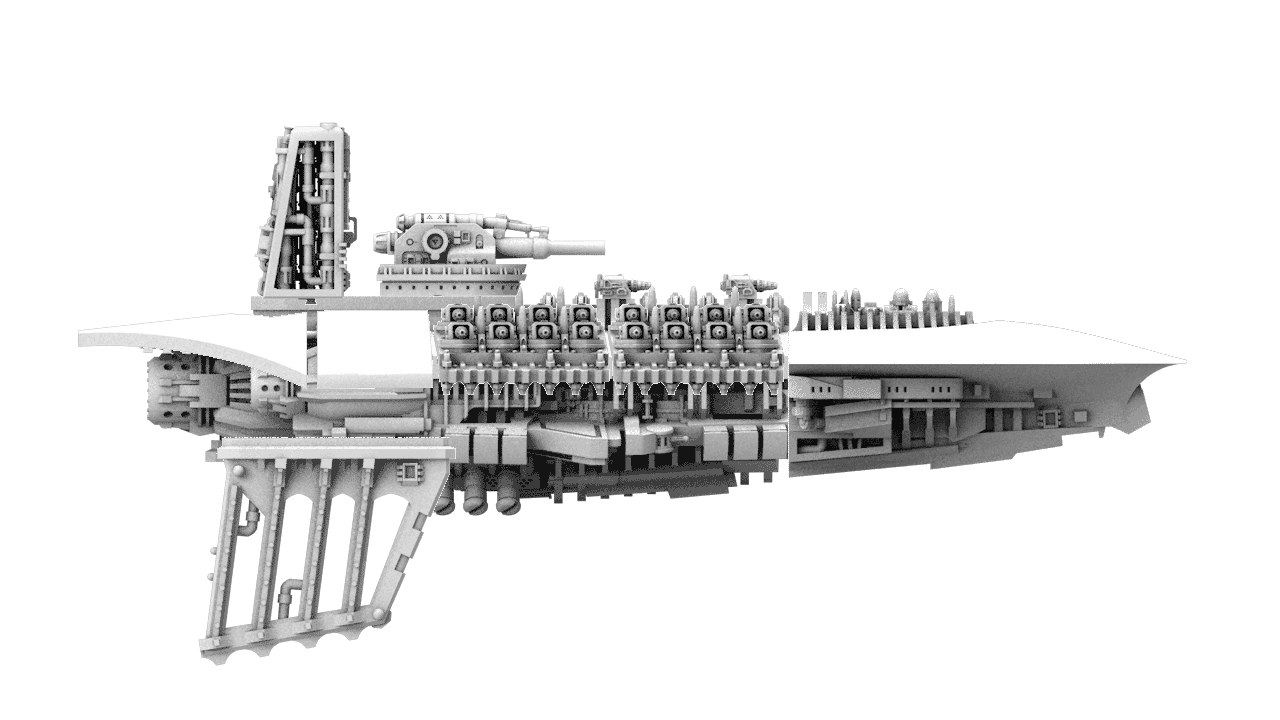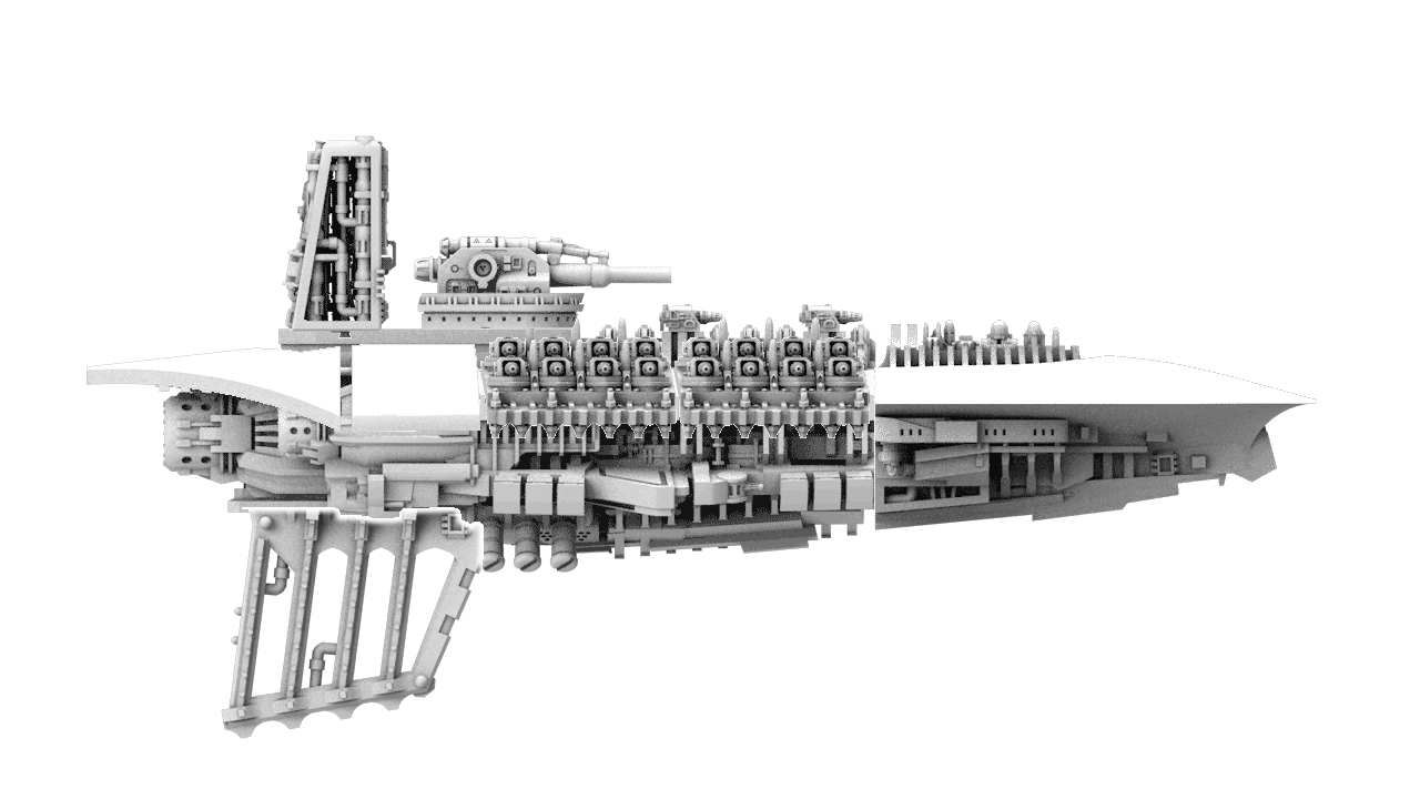 The ship model is around ~9cm (3.5″) long in total length, or 6cm (2.4″) long for the core body with armour plates attached.