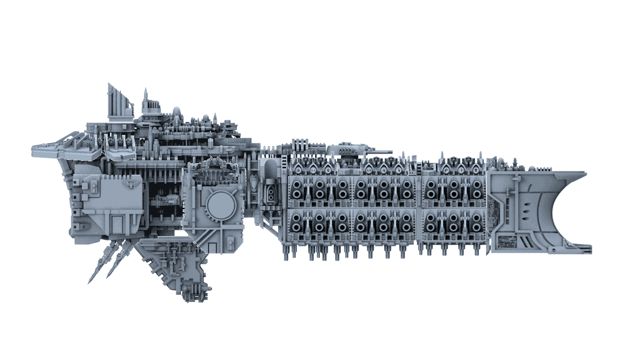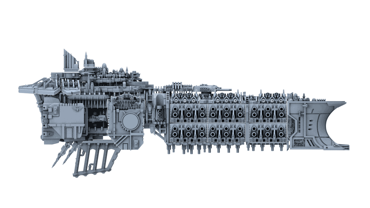 The M1 Imperial Dreadnought was a late entrant to the Pre-Imperial era, a vanity project by an influential Admiral who believed that more guns was always better. It was designed by retrofitting the successful Grand Battleship chassis with 50% more weaponry. This was achieved by sacrificing mobility and armour for a blistering broadside that could destroy all targets in one hit. Some variants sported a supermassive dorsal cannon the size of a medium corvette.