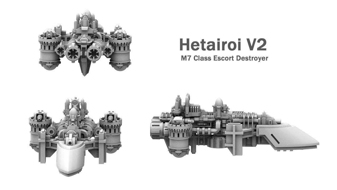 The Hetairoi is a heavy escort, pushing the upper weight limits of the class. The vessel was introduced in AE60 in response to general unrest in the outer rim worlds and increasing casualties of the merchant fleet. Unfortunately, Ships of the Line could not be spared from the front, and so the Hetairoi was born – a heavily armoured weapons platform boasting Mk3 guns on each flank. They were deployed to escort convoys of lumbering super-freighters.